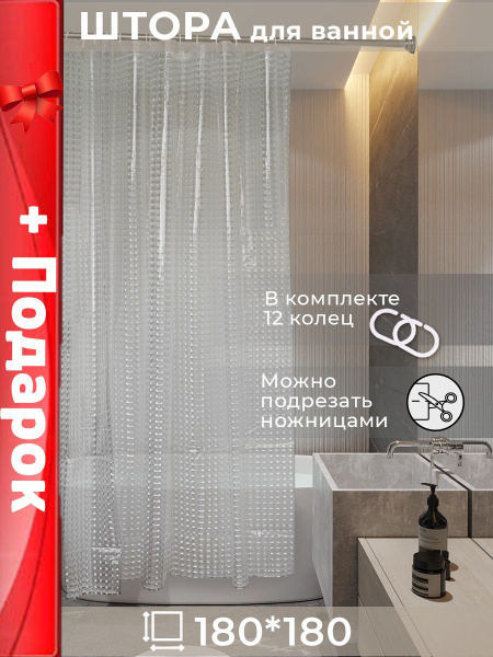 Штора для ванной 180x180 см шторка прозрачная