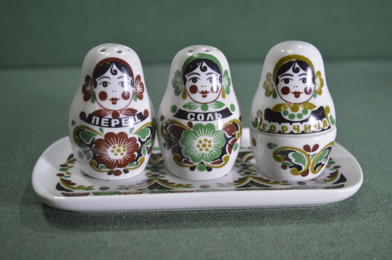 Купить Набор фарфоровый на подносе солонка перечница горчица "Матрешки