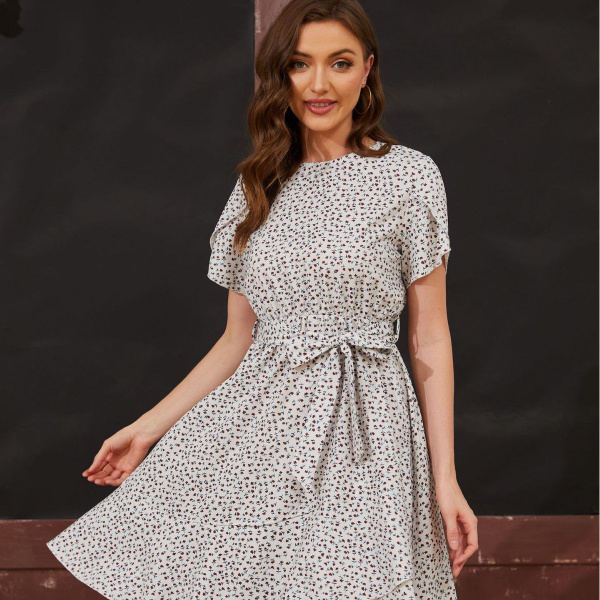 Женское платье в цветочек с круглым вырезом и короткими рукавами