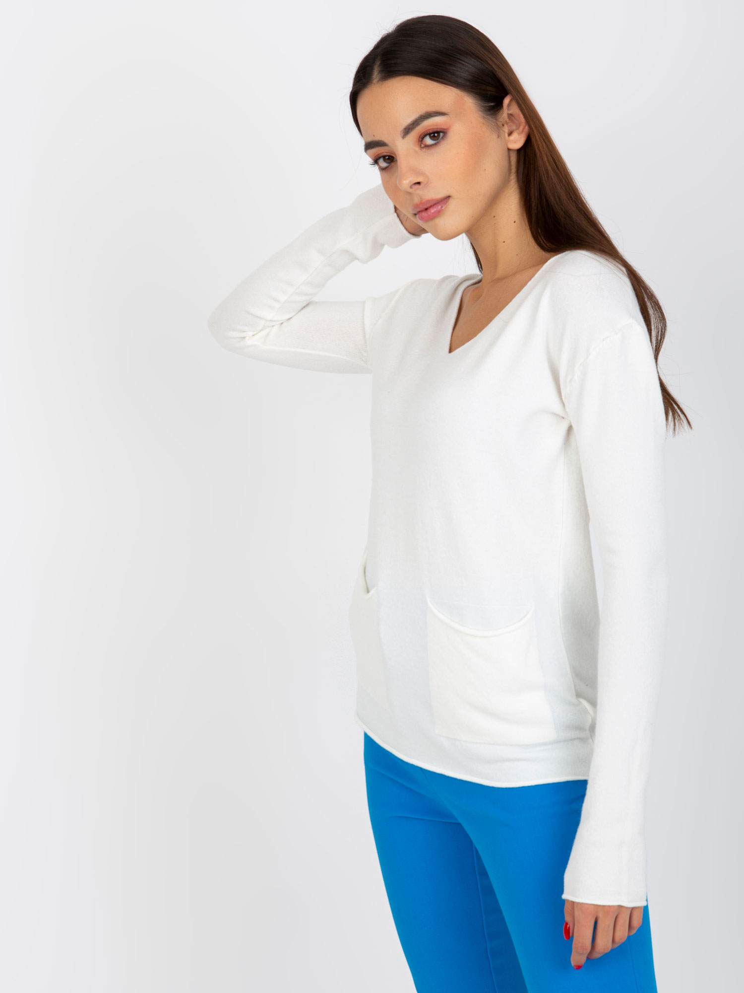 Тънък пуловер с джобове в бяло